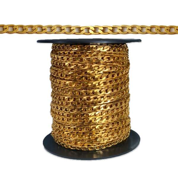 Descrição Corrente de Alumínio Cartier Lixada Dourada 5x8mm - Por Metro