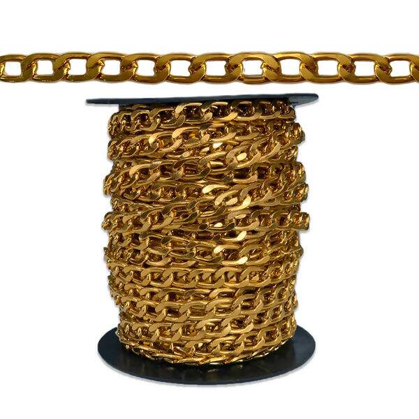 Descrição Corrente de Alumínio Cartier Lixada Dourada 9x15mm - Por Metro