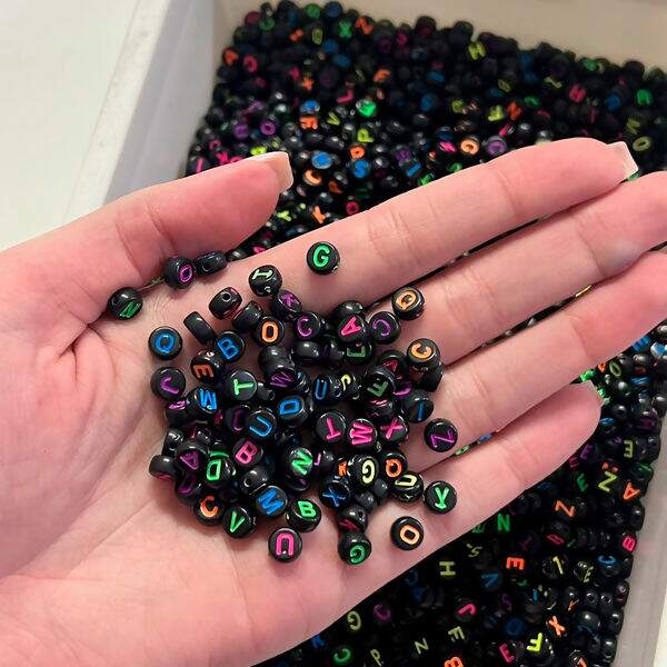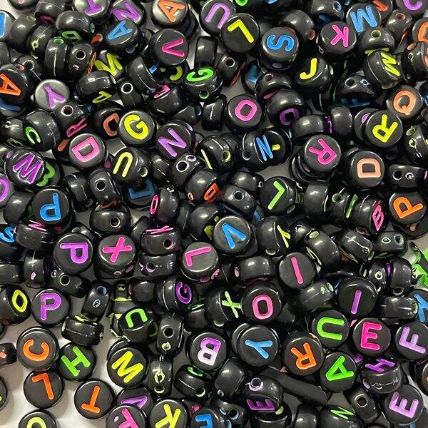 Descrição Letrinhas coloridas fundo preto com furo passante - 45 g